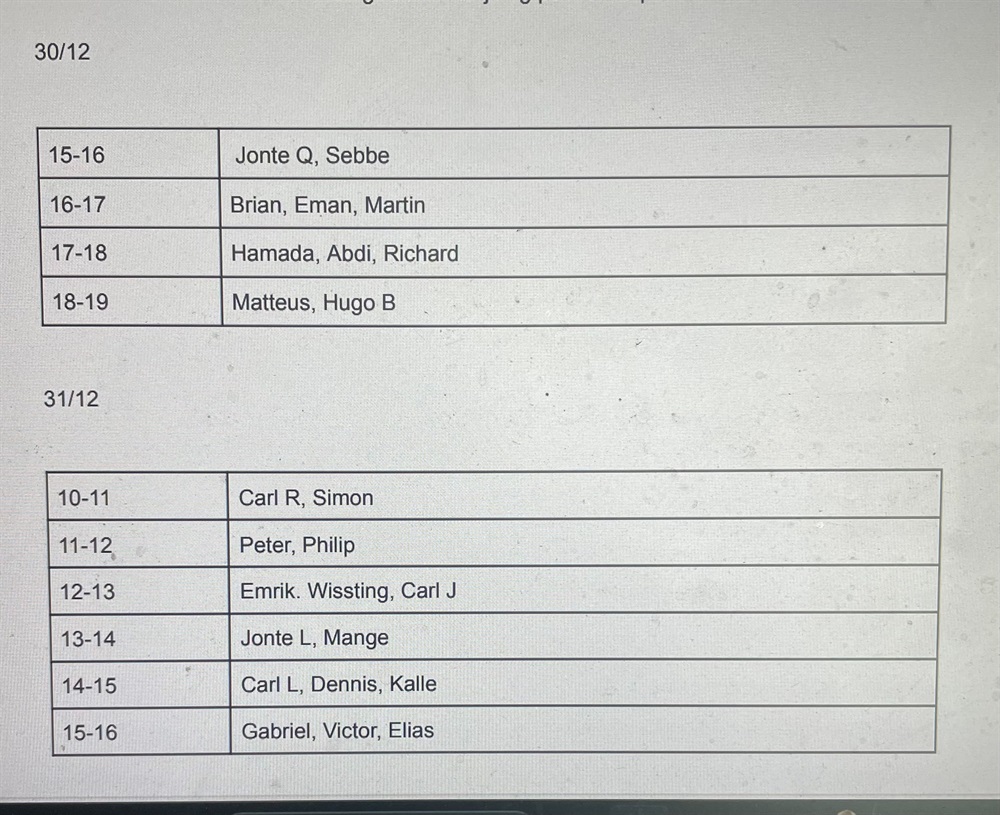 Stefan ansvarar för uppstart och avslut båda dagarna och allt material och instruktioner kommer att finnas framme så allt är klart när ni kommer. Alla spelare har fått en timme var att ansvara för. Går det av någon anledning inte så byt med varandra, skicka nån släkting eller lös det på annat sätt.